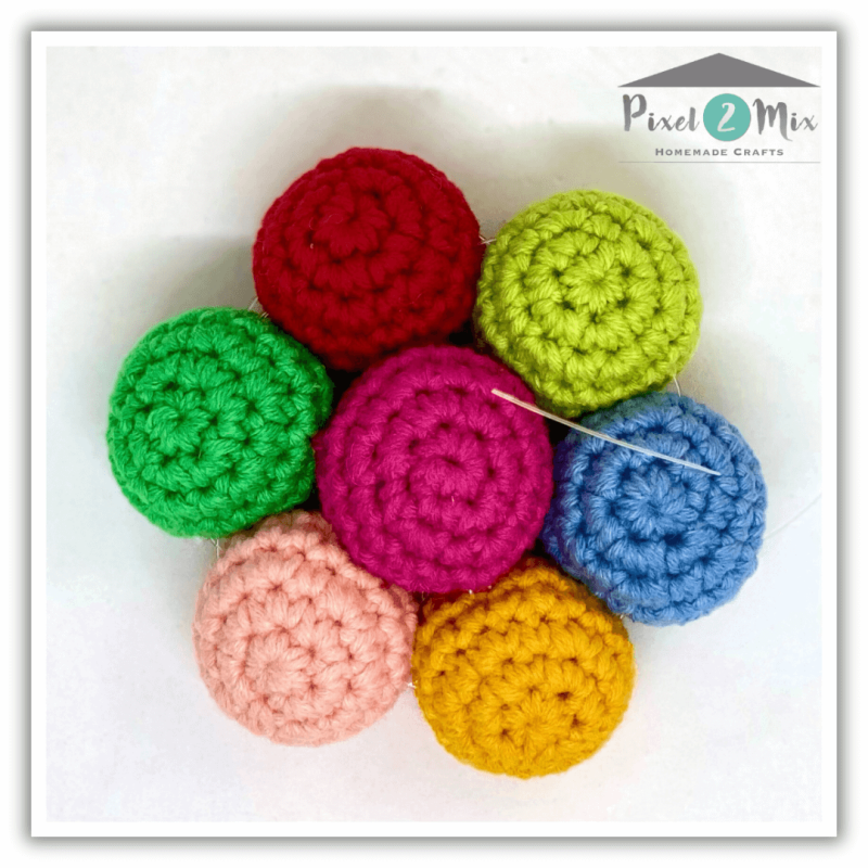 | - | Je rijgt 3 balletjes met pootjes en 3 ‘gewone’ balletjes aan een draad tussen Toer 4. en 5. van elk balletje vanaf de bovenkant met 9 steken ertussen. Maak hem rond door voor een 2e keer in te steken in dezelfde steken, voor stevigheid. Trek de draad strak aan, zodat je deze niet meer ziet. |