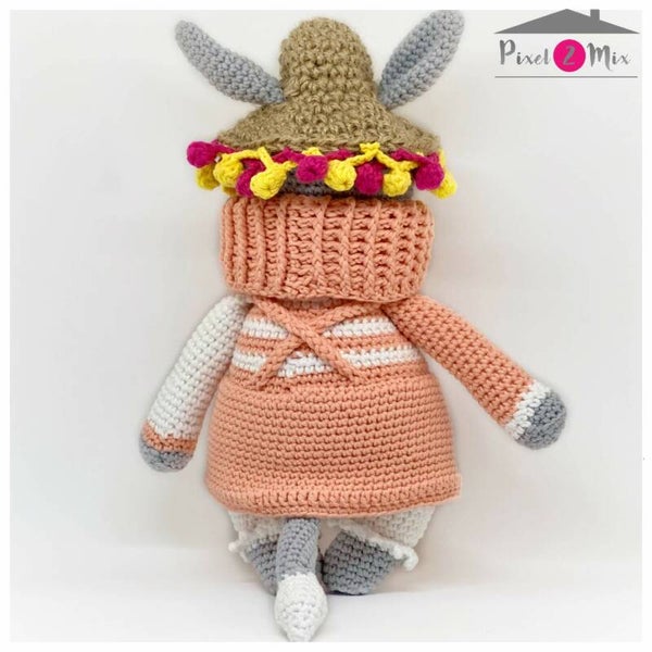 Donatella is een Handgemaakte gehaakte knuffel van Durable Cosy Fine garen met haaknaald 4 en 4.5. Donatella is ca. 32 cm hoog inclusief stro-hoed/oortjes, zonder hoed ca. 26 cm.