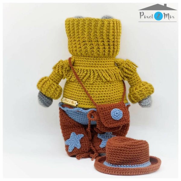 Harry is een Handgemaakte gehaakte knuffel van Durable Cosy Fine garen met haaknaald 4 en 4.5. Harry is ca. 32 cm hoog inclusief Cowboy hoed, zonder Cowboy hoed ca. 28 cm