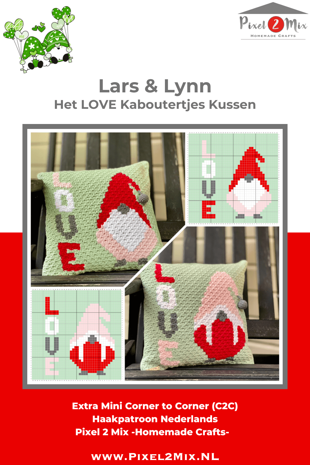 Haak nu zelf Lars & Lynn - Het LOVE Kabouter Kussen! Dit romantische Extra Mini Corner to Corner (C2C) haakpatroon toont twee verliefde kabouters in één kussen. Het haakpatroon is beschikbaar in het Nederlands en in het Engels.: