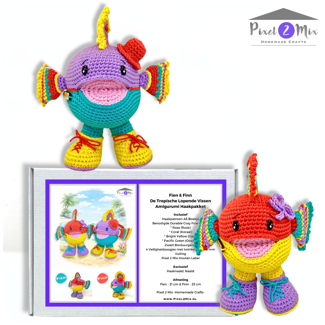 Haak zelf jouw eigen Fien & Finn – De Tropische Vissen, die kunnen lopen en zwemen met dit complete Amigurumi haakpakket van Pixel 2 Mix –Homemade Crafts–, een uniek en vrolijk haakproject voor beginners en gevorderden.
