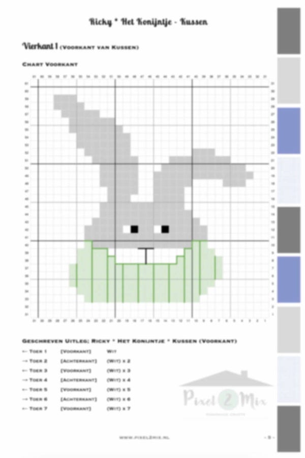 In het patroon tref je naast de grafische hokjestekening ook een geschreven uitleg aan, zodat je of hokjes kan tellen of per diagonaal ziet in welke kleur je een blokje moet haken bij de geschreven uitleg. Het patroon gaat in diagonalen van rechtsonder naar linksboven.