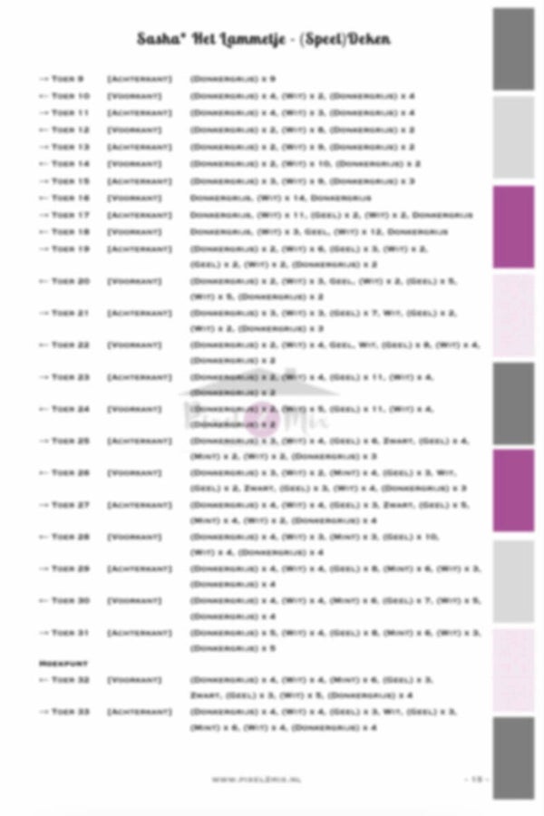 In het patroon tref je naast de grafische hokjestekening (12x) ook een geschreven uitleg (12x) aan, zodat je of hokjes kan tellen of per diagonaal ziet in welke kleur je een blokje moet haken bij de geschreven uitleg. Het patroon gaat in diagonalen van rechtsonder naar linksboven.