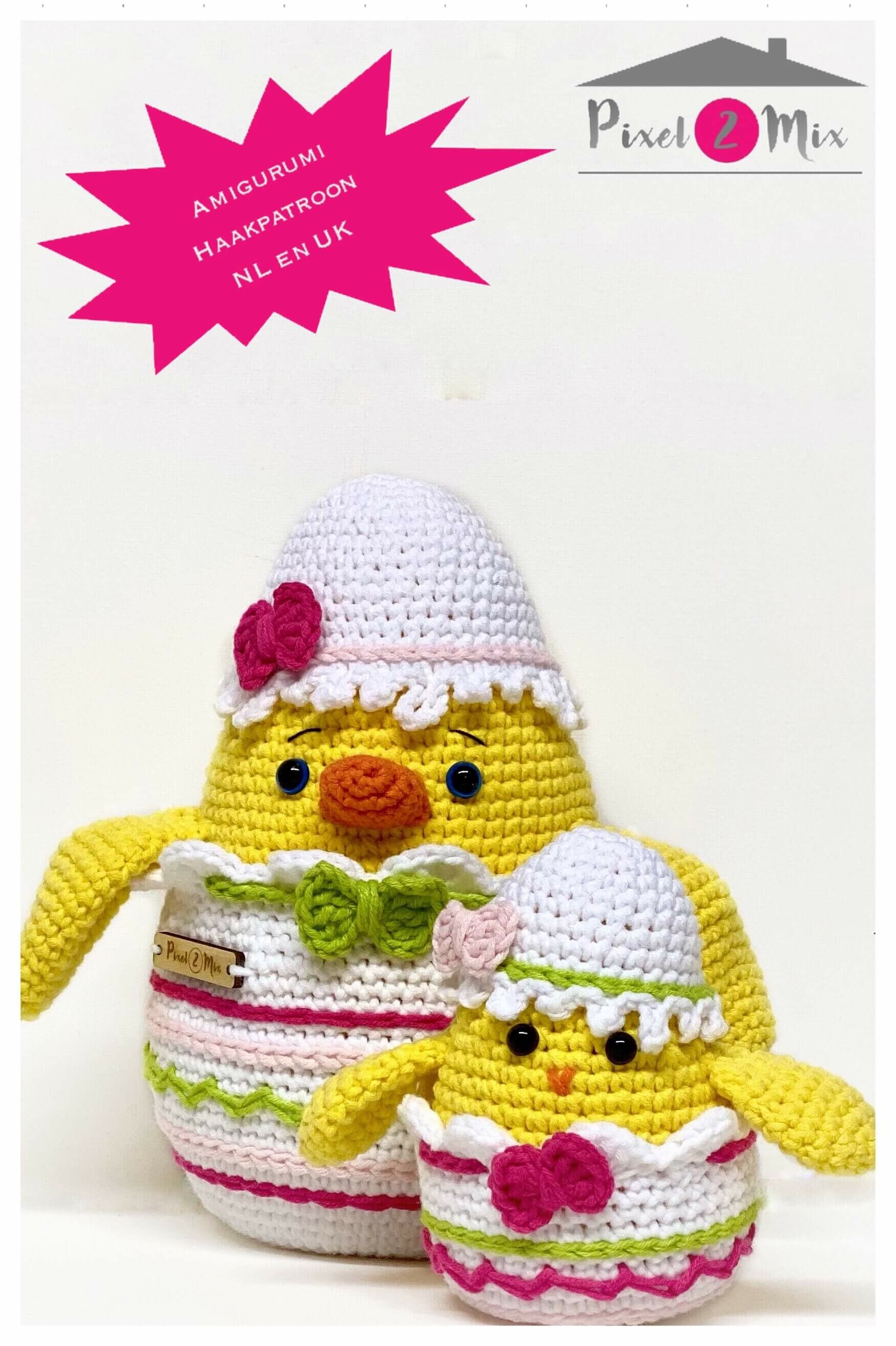 Wij zijn een haakpatroon in papieren vorm in het Nederlands of in het Engels. Je kan ons met dit patroon ook zelf maken, zodat je ook met ons kan knuffelen, spelen én ook als decoratie kan neerzetten om in de onderste eierdop bijvoorbeeld (Paas)eitjes te doen.