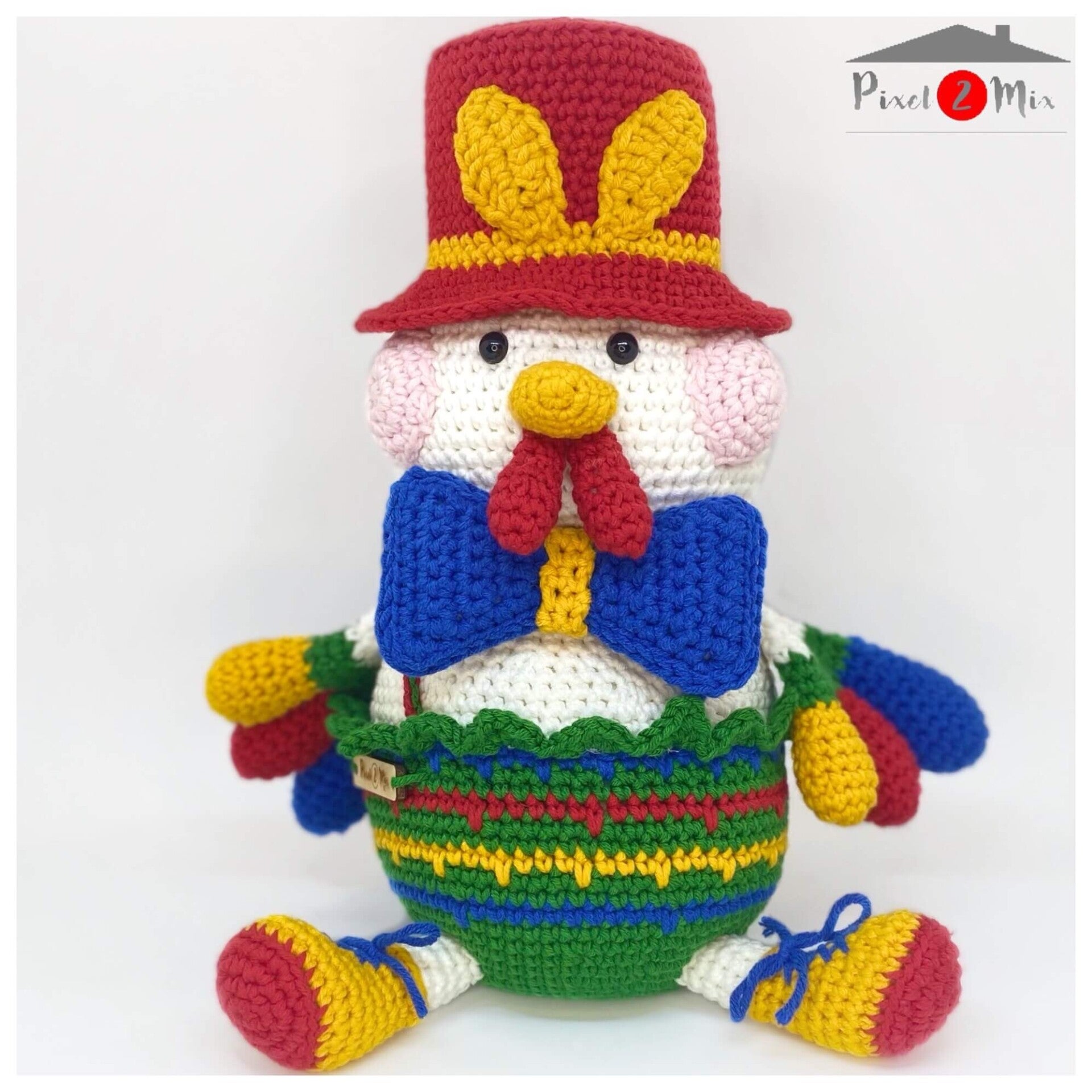 Cucu is een Handgemaakte gehaakte knuffel van Durable Cosy Fine garen met haaknaald 4.0. Cucu is ca. 25,5 cm hoog t/m de hanenkam en met hoed ca. 26 cm.